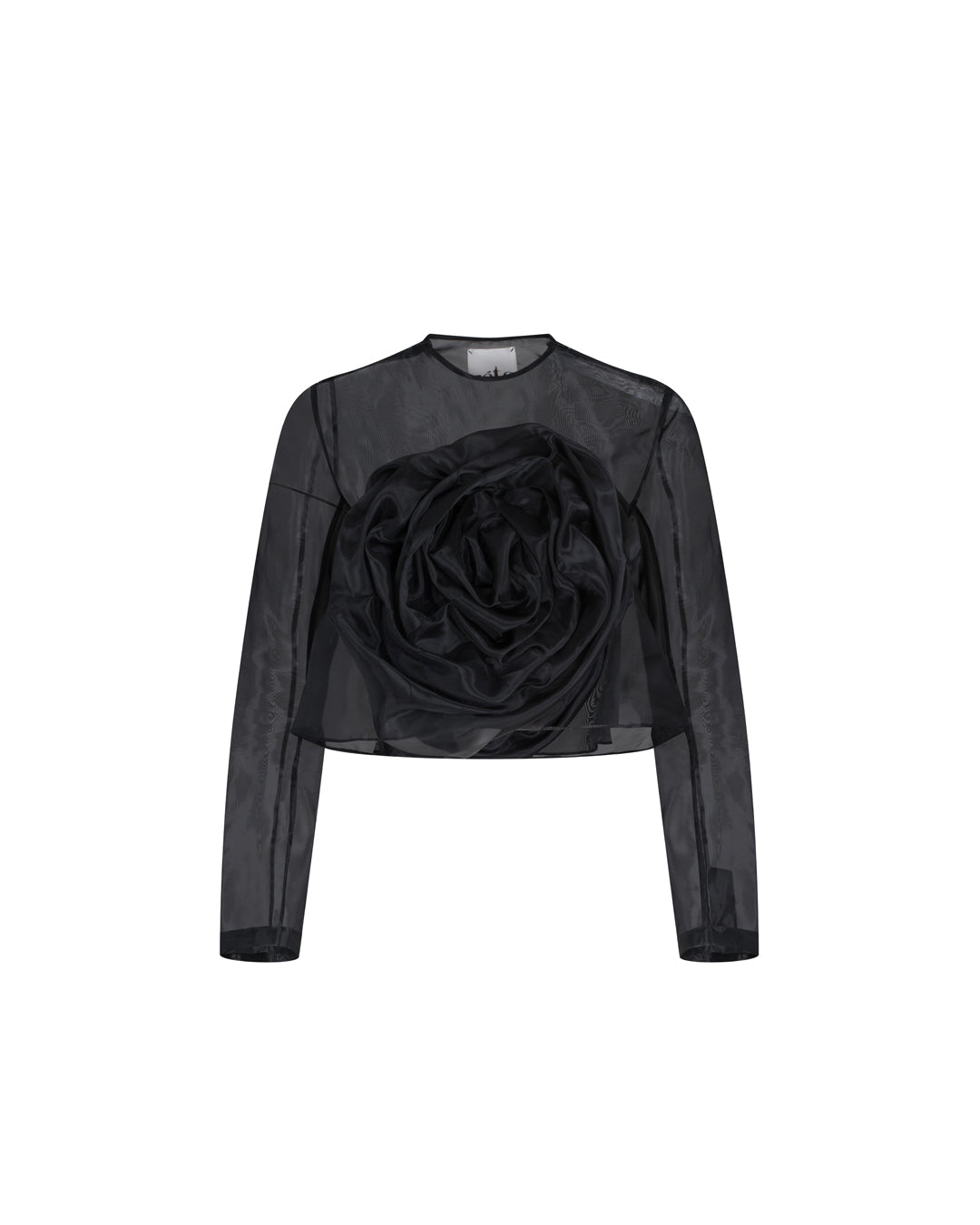 Confeccionado con una organza de mezcla de poliéster con efecto mojado, este impresionante top presenta una rosa drapeada a mano colocada estratégicamente en el busto, con mangas largas de corte preciso. Cierres de cremallera invisibles en los hombros. Puños de las mangas adornados con botones de perlas de vidrio checo.