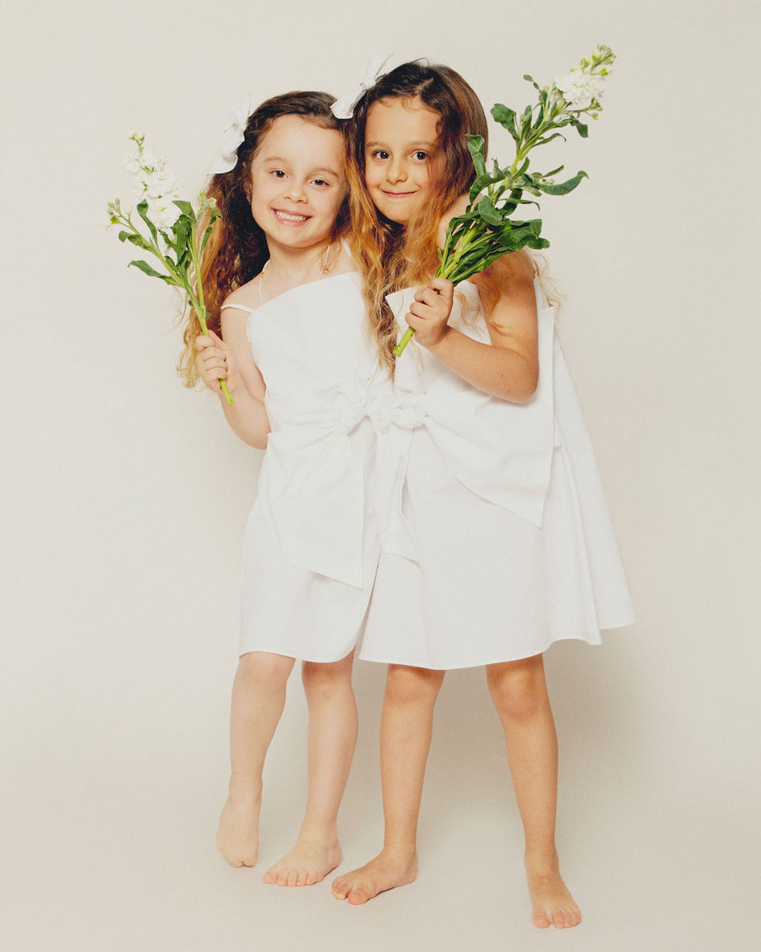 Elaborado a partir de popelina 100% algodón, este mini vestido es corto y dulce. Con un lazo de gran tamaño anudado a mano en la cintura y una falda en forma de burbuja.