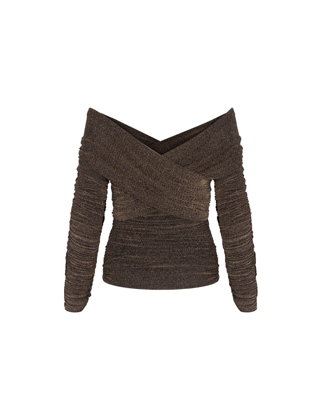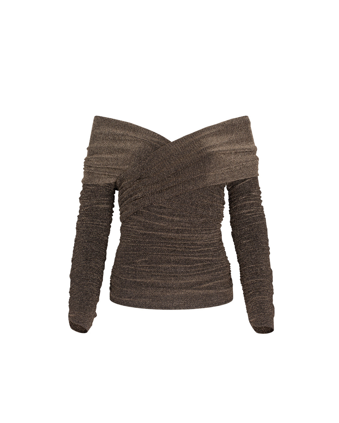 Elaborado con una mezcla de lurex y licra, este top corto presenta delicados frunces a los lados y un escote al estilo clásico de Hollywood, dejando los hombros al descubierto.